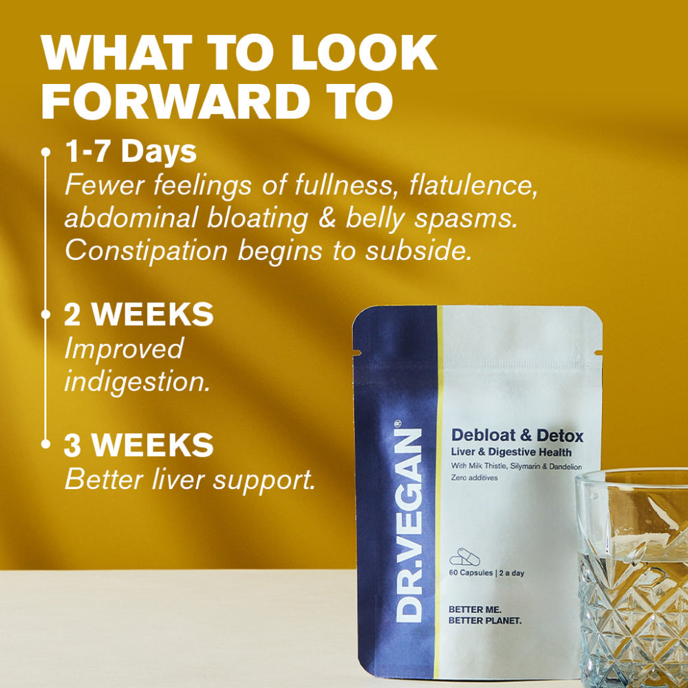 Feeling bloated? Take control of your digestive health with Debloat & Detox, the acclaimed dietary supplement from DR.VEGAN. Made from 100% natural ingredients, this advanced blend of botanicals, minerals and vitamins helps you to relieve abdominal bloating whilst naturally detoxifying your liver. Enjoy rapid relief for digestive-related bloating, eliminate excess gas and support your gut health with the prebiotic qualities of this blend. So relax, detox, and debloat.