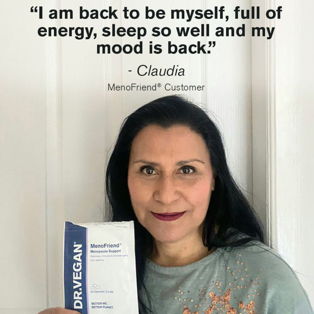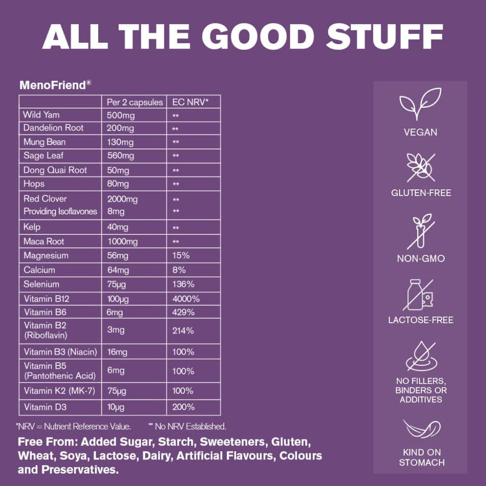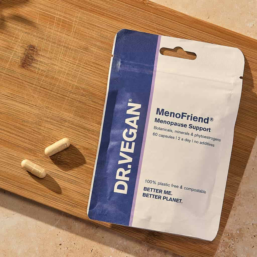 DR.VEGAN's MenoFriend Menopause Support capsules are made from an acclaimed blend of clinically tested botanicals, minerals and phytoestrogens. 100% natural, MenoFriend is made from 19 plant-based ingredients - including Wild Yam, Red Clover, Dong Quai, Calcium and Magnesium, which may provide support for hormonal regulation, mood, energy, clear thinking, mental performance, and muscles.