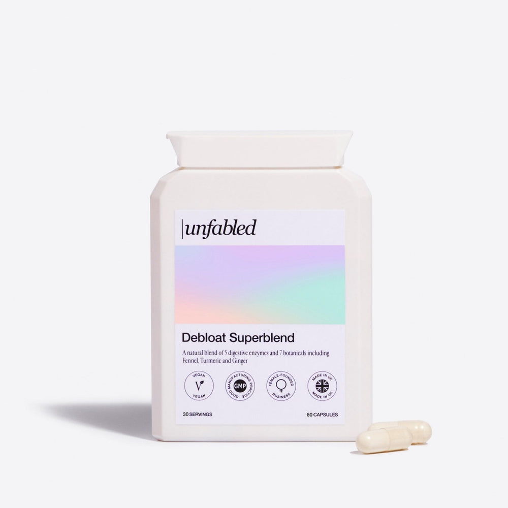 Struggling with stubborn bloating? Meet Unfabled's Debloat Superblend, your go-to for rapid, targeted relief. Our vegan-friendly supplement blends 5 digestive enzymes with 7 natural bloat-relieving ingredients, including Peppermint Leaf, Ginger, and Fennel Seed, to support you with quick and efficient relief when you need it. Whether you’re dealing with post-meal discomfort, PMS bloating or an endo belly flare-up, take a quick capsule or two to help soothe your stomach and reduce bloating.